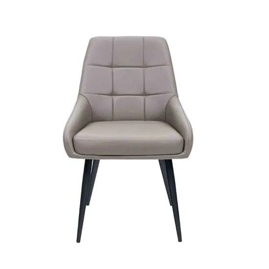 A beautifully scalloped dining chair design with cross pattern stitching, the ultimate level in comfort and practicality. Finished with black poweder coated legs